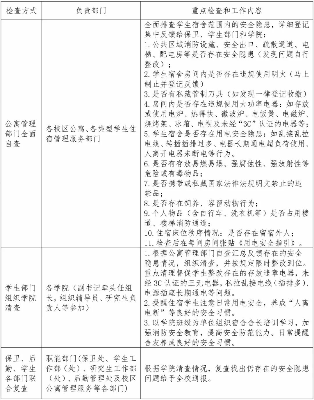 通知指出,各单位要强组织领导,强化责任落实。各单位务必高度重视,牢固树立校园安全红线意识和底线思维,按照“党政同责、一岗双责、失职追责”要求,细化实施方案,明确工作职责、目标任务和措施要求,各负其责,加强沟通,协同配合,及时消除火灾隐患,坚决预防和有效遏制火灾事故的发生,确保各项消防安全管理措施有力、责任到位。要坚持问题导向,突出隐患整治。各单位要坚持问题导向,突出重点内容和薄弱环节的整改,做到边检查边整改、以督查促整改,尤其是各学院要协同学生、保卫和后勤等部门,加强对重点群体的摸查、排查,切实落实疏导、教育、救治、管控等措施,防止发生极端行为,真正排查整治各类安全隐患。要强化标本兼治,构建长效机制。各单位要把校园消防安全大检查与学校综合治理工作、国家“一流学科”建设和高水平大学建设等工作结合起来,规范制度,强化责任担当,加强安全教育,各学院应协同有关单位应积极开展安全教育,每年至少组织一次安全教育专题培训,把消防安全教育与检查贯穿于日常管理工作,努力构建学校安全管理长效机制。