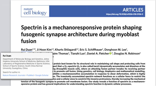 5月25日,体育科学学院教授段锐博士以第一作者在Nature Cell Biology (自然-细胞生物学)上发表了题为“Spectrin is a mechanoresponsive protein shaping fusogenic synapse architecture during myoblast fusion”(https://www.nature.com/articles/s41556-018-0106-3)的研究论文。